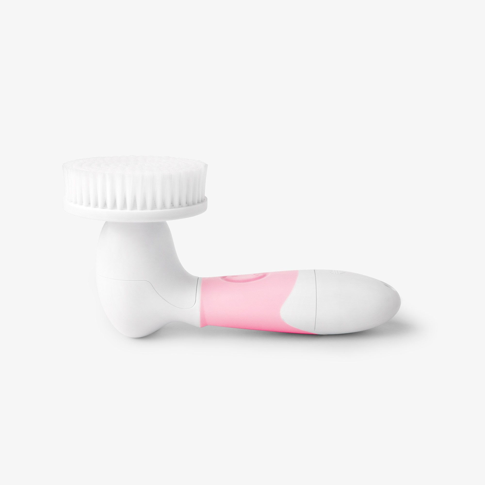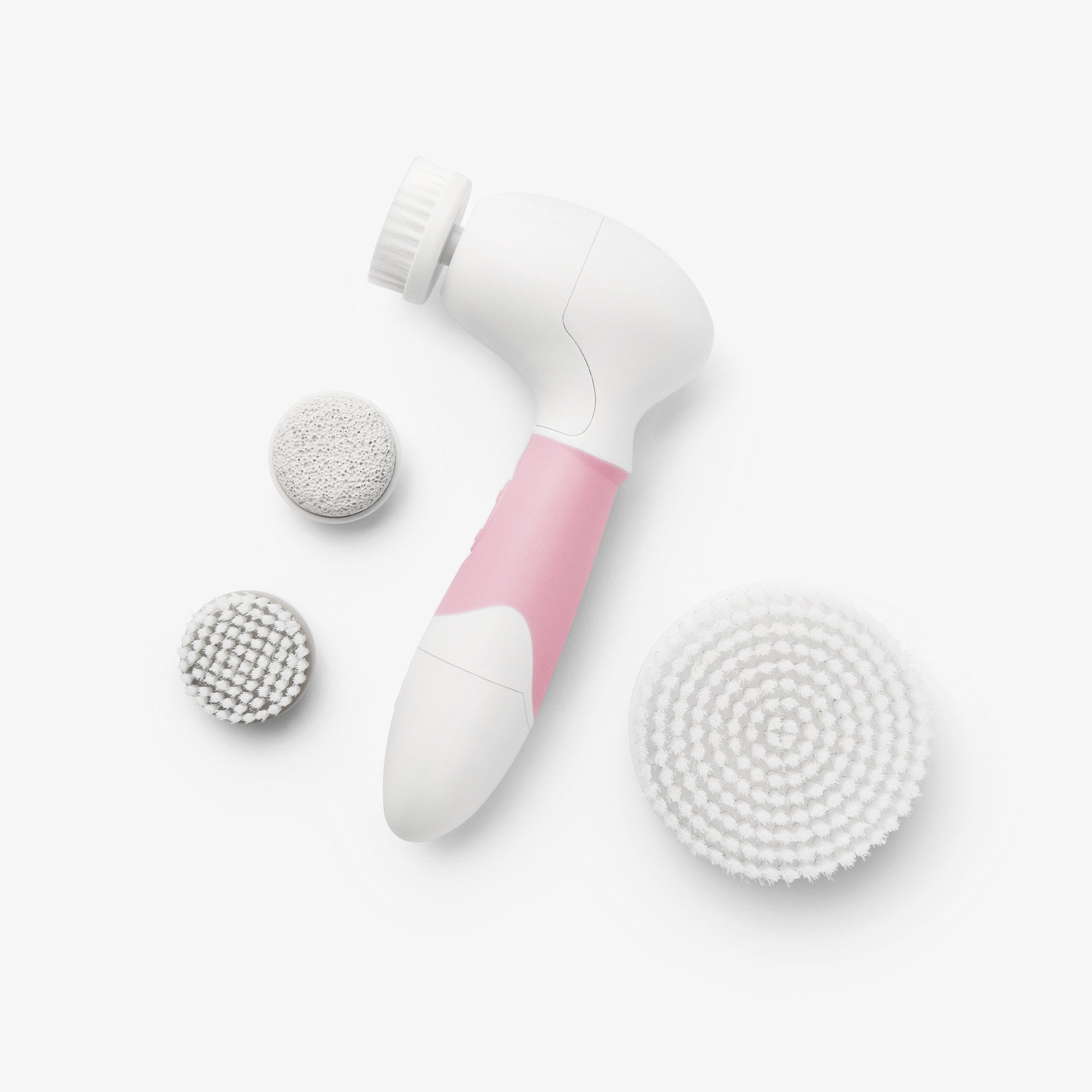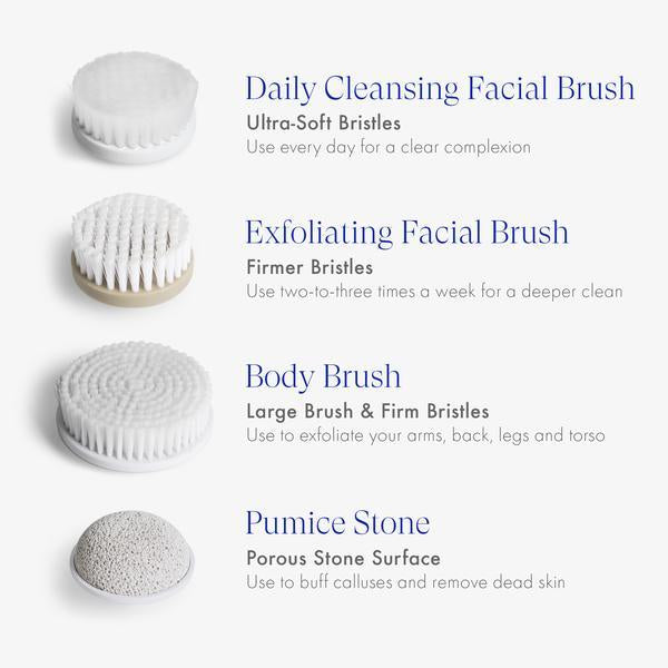 Discover head-to-toe radiance with our 360°-rotating face and body brush that has four attachments for your every need.